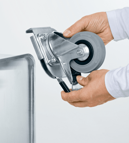 Clip-On hjulene monteres raskt og enkelt uten bruk av verktøy. Selges i sett á 2 stk. Dra over et låsehåndtak, så sitter hjulet fast. Clip-On hjulsettet passer til alle standard Zarges aluminiumskasser i seriene K-470 og Eurobox.
