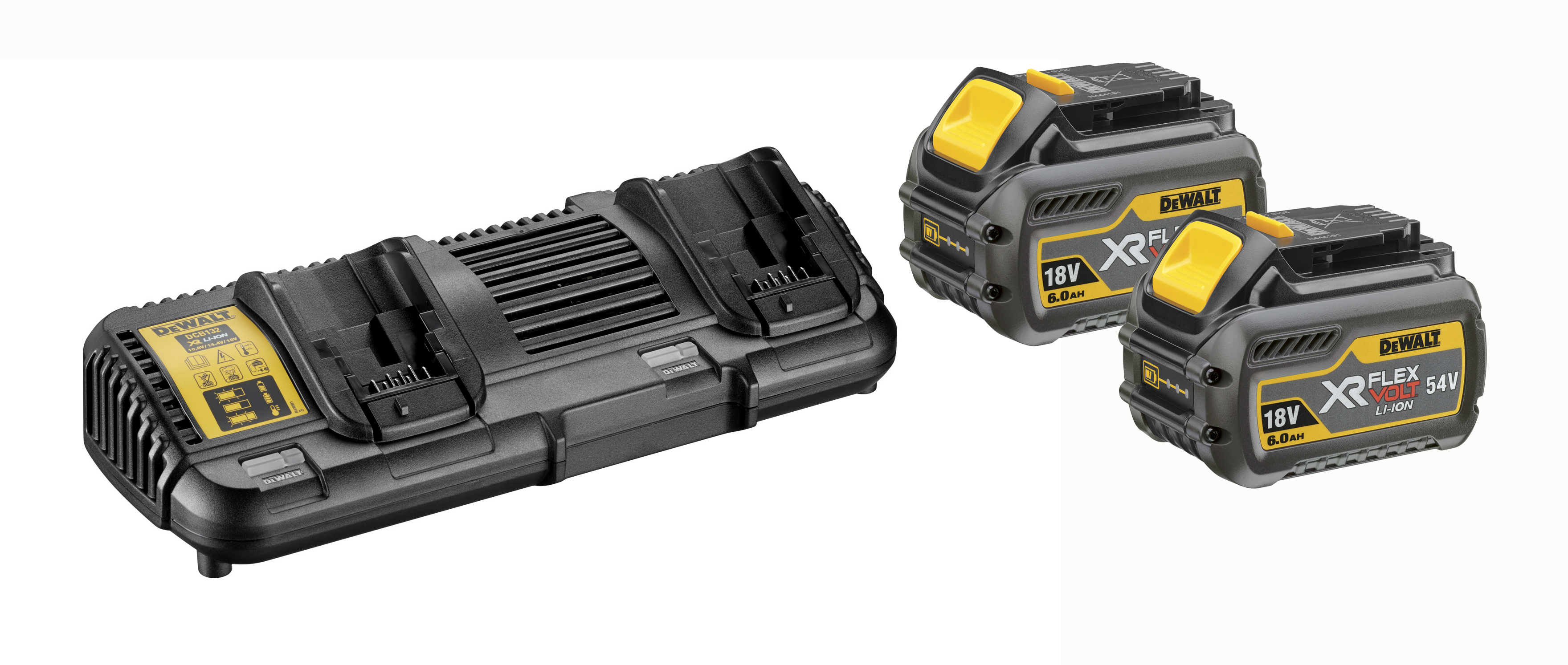 Den doble multiladerene 54/18v lader 2x 54v- 6 Ah batterier samtidig ved en 4,0 Ah utgående strøm. XR FLEXVOLT fra DEWALT er det eneste batteri på markedet som kan veksle fra 54V til 18V noe som gjør det retro-kompatibelt med dine eksisterende 18V produkter!