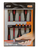 Skrutrekkersett, BE-9882S Ergo Skrutrekkersett med 5 stk. isolerte skrutrekkere for spor- og Pozidriv-skruer. Godkjent til arbeid under spenning opp til 1000 volt. Godkjent etter IEC 60900, DIN-EN 60900, VDE 0682 del 201. Kvalitetskontroll etter de nyeste nasjonale og internasjonale standarder: - kontroll av hver skrutrekker i vannbad med 10 KV. - merking med fabrikasjonsår. - utvidet kuldesjokk test. Utførelse Forkrommet, høyglanspolert klinge. Materiale VANADIUM EKSTRA Ergonomisk 3-komponents skaft av polypropylen og termoplastisk materiale. Forsynt med herdet og svartoksidert spiss. Fargekode og symbol i håndtaket gjør det lett å velge den riktige skrutrekkeren til oppgaven. Inneholder Dimensjon BE-8040S, BE-8050S, BE-8220S, BE-8810S, BE-8820S