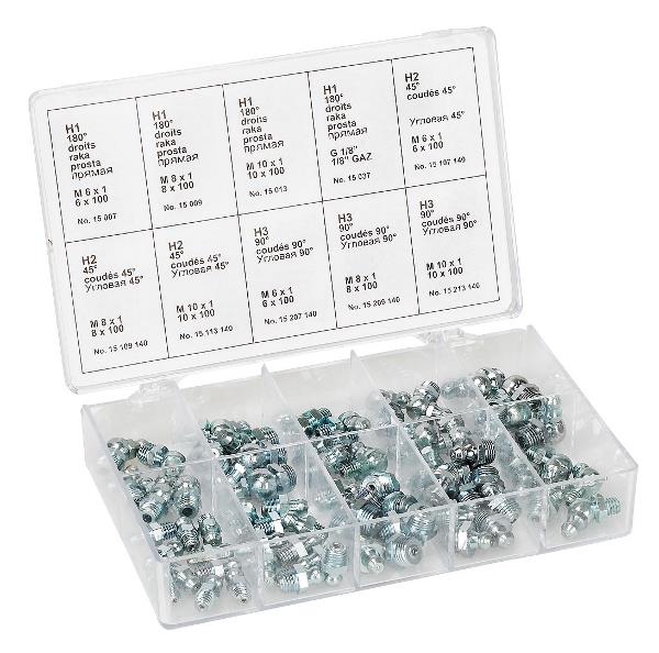 Nr 16092. Sortiment med 10 ulike smørenipler (totalt 70 stk). Rette - M6x1, M8x1, M10x1 og G (R) 1/8. 45° - M6x1, M8x1, M10x1. 90° - M6x1, M8x1 og M10x1. I plasteske.Nr 16090. Sortiment med 12 ulike nipler (totalt 140 stk). M6x1, M8x1, M10x1, G (R) 1/8 av rett, 45° og 90° modell. I plasteske.Nr 16099. Sortiment av 27 ulike smørenipler (alle gjenger og grader representert) samt 17 stk 4-bakket hydrauliske koblinger. I plasteske.Nr 170 23 125. Industritilbehørsett som inneholder det meste som servicepersonale, reisemontører m.m. trenger ved vedlikeholdsarbeider etc. Inneholder 21 stk ulike deler, bl.a. koblinger, adaptere, påfyllingsnipler, forlengere, virvelkoblinger, tetninger, gummipanserslanger etc. Inneholder totalt 85 stk komponenter. I plasteske.